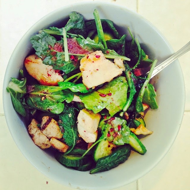 Cook chicken in skillet with seasonings (I use TJ's 21 season salute OR a poultry seasoning); slice cumber, mix in salad in a bowl, add cooked chicken, toss and top with vinaigrette.